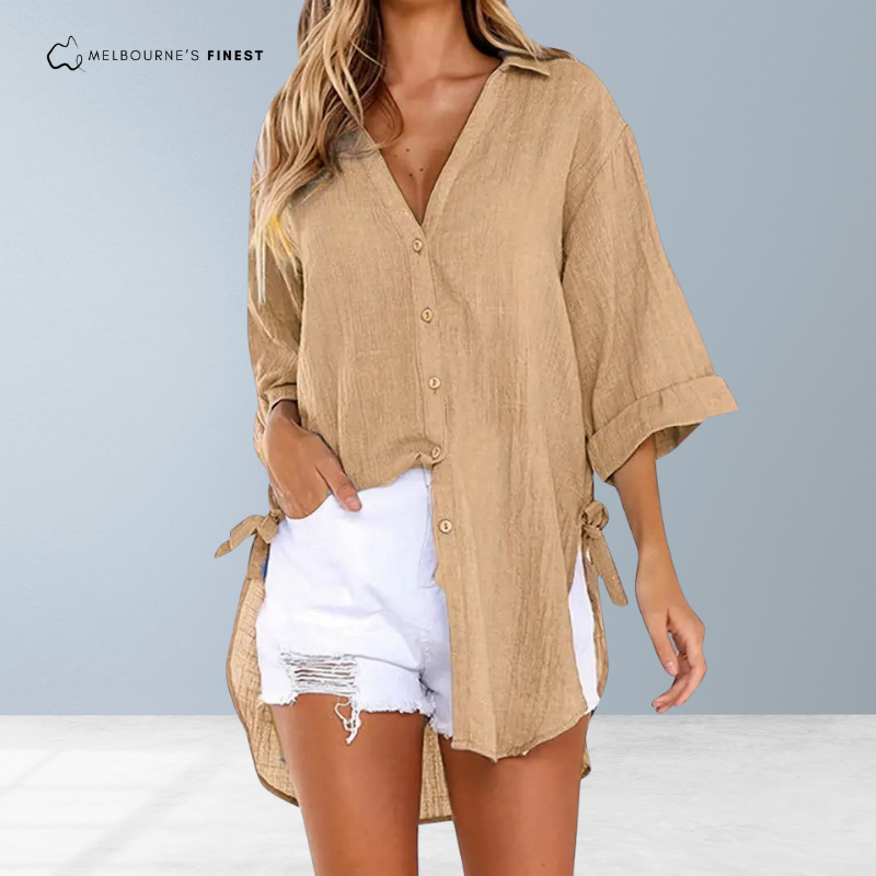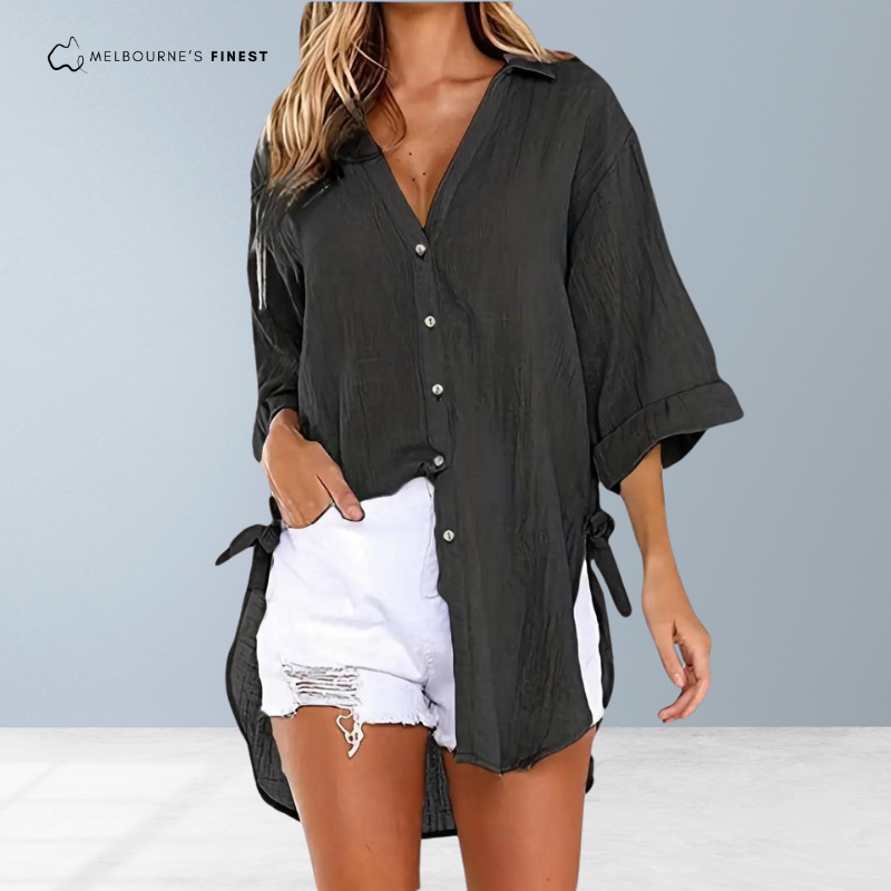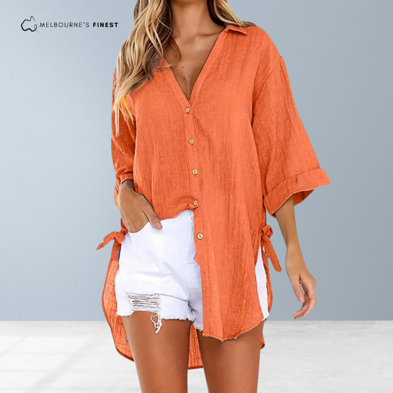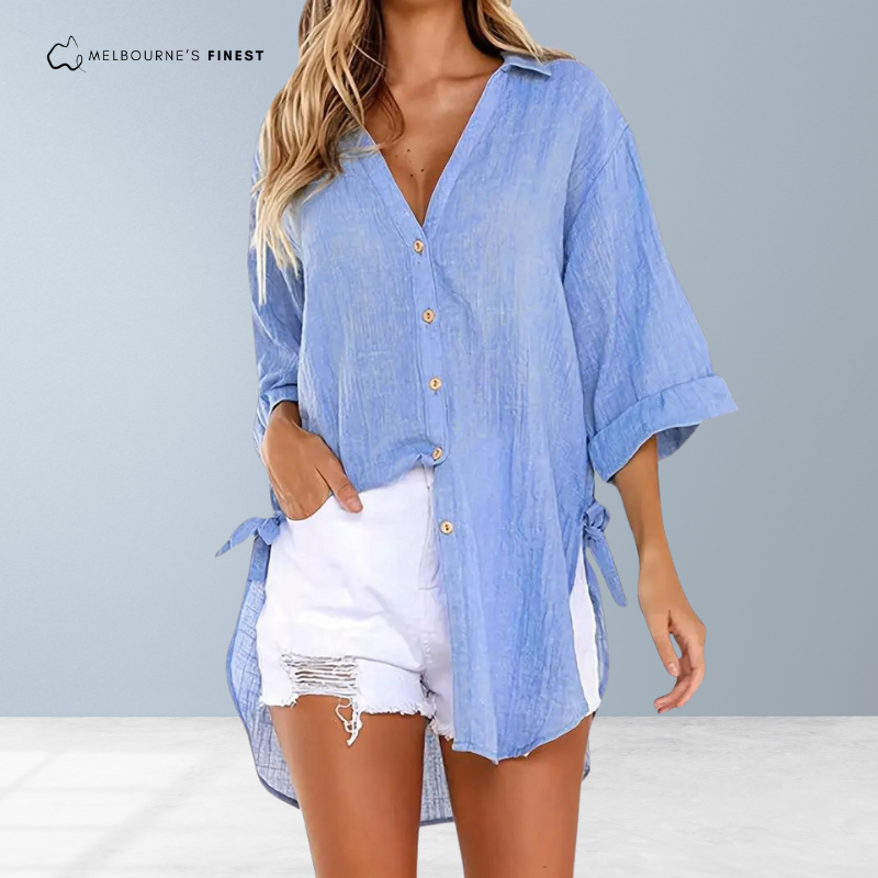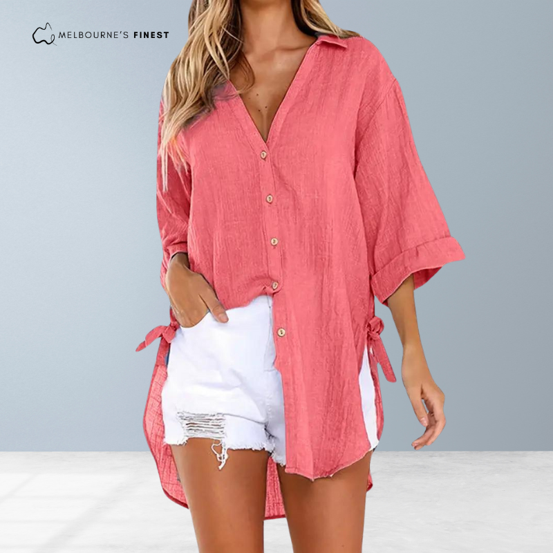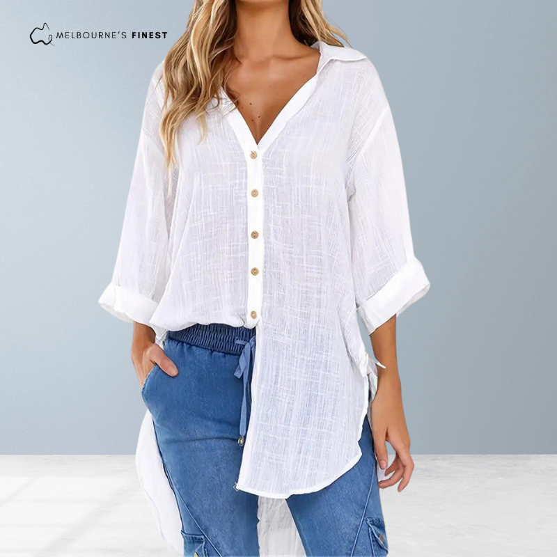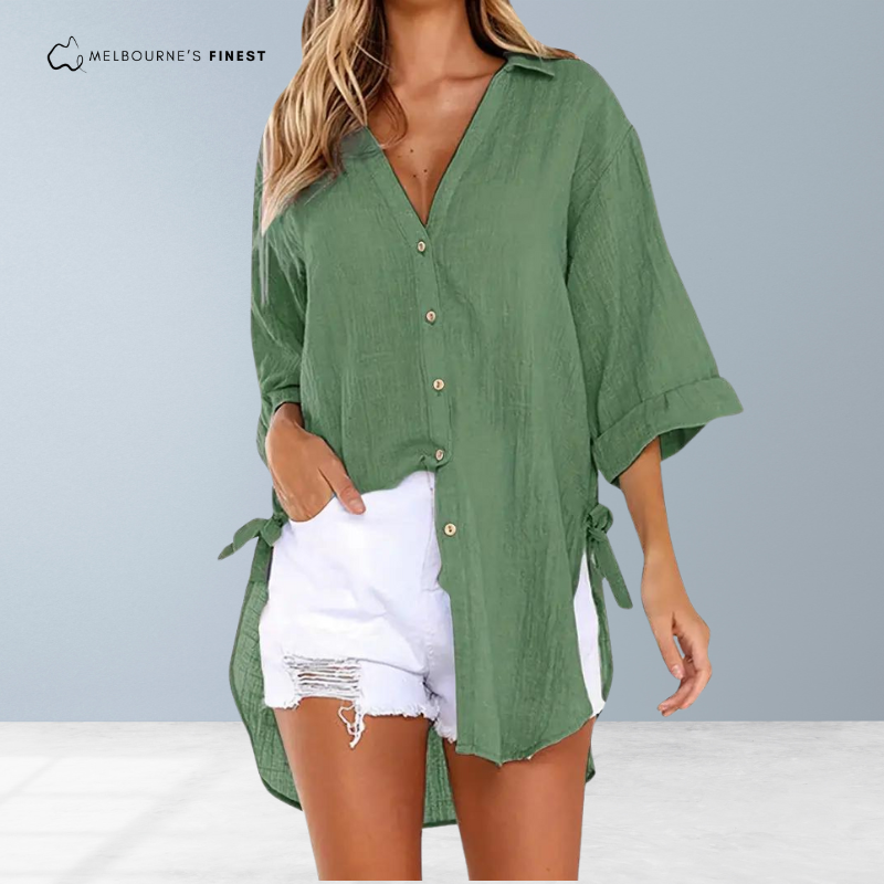 Indulge in the luxurious comfort and timeless style of the Esmeralda™ Oversized Women's Blouse. Crafted with an oversized silhouette, this blouse offers unparalleled comfort while exuding effortless elegance. Unlike traditional blouses, the Esmeralda™ boasts a v-neck design that complements your neckline, adding a touch of sophistication to your look.