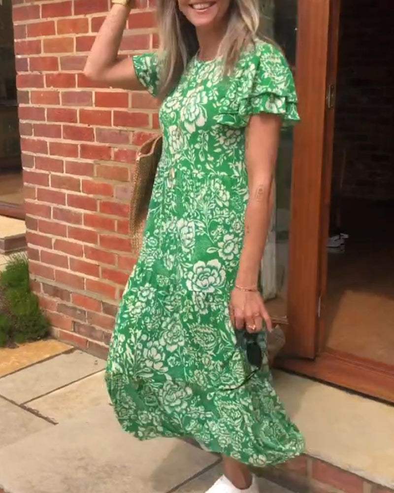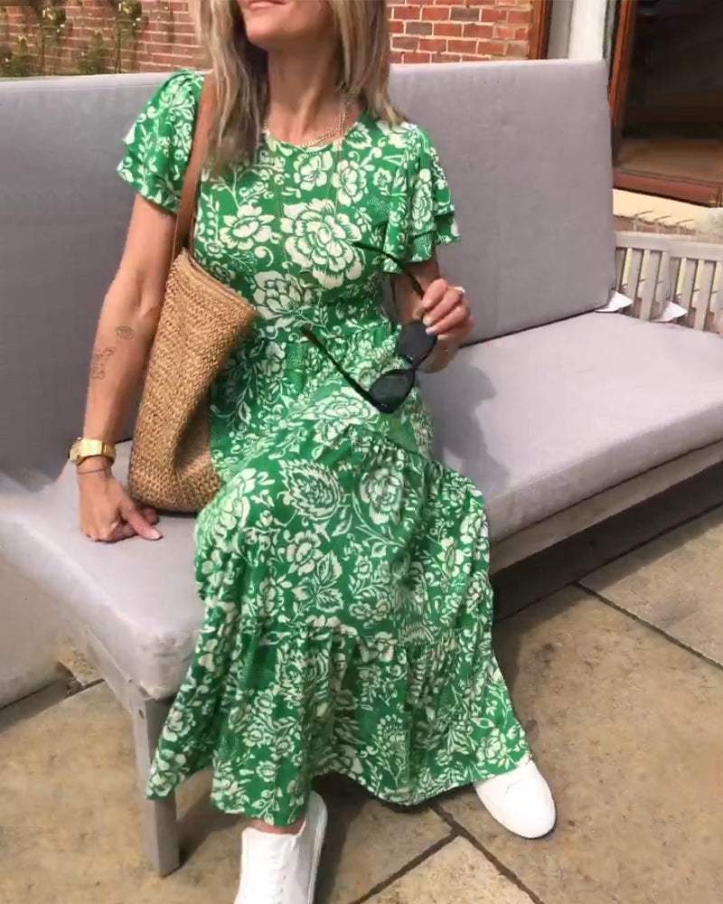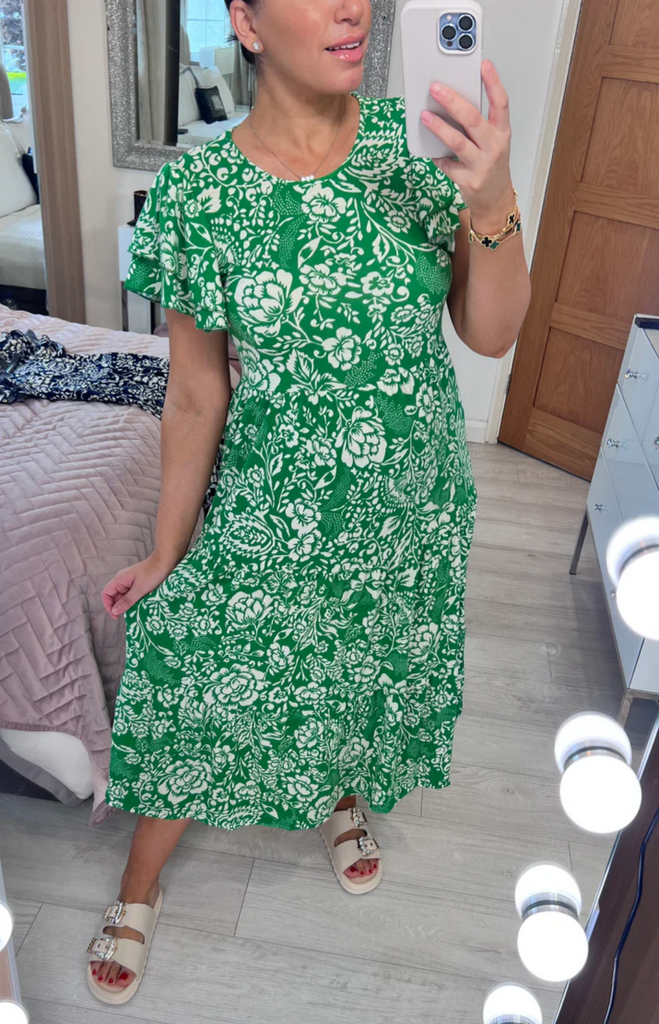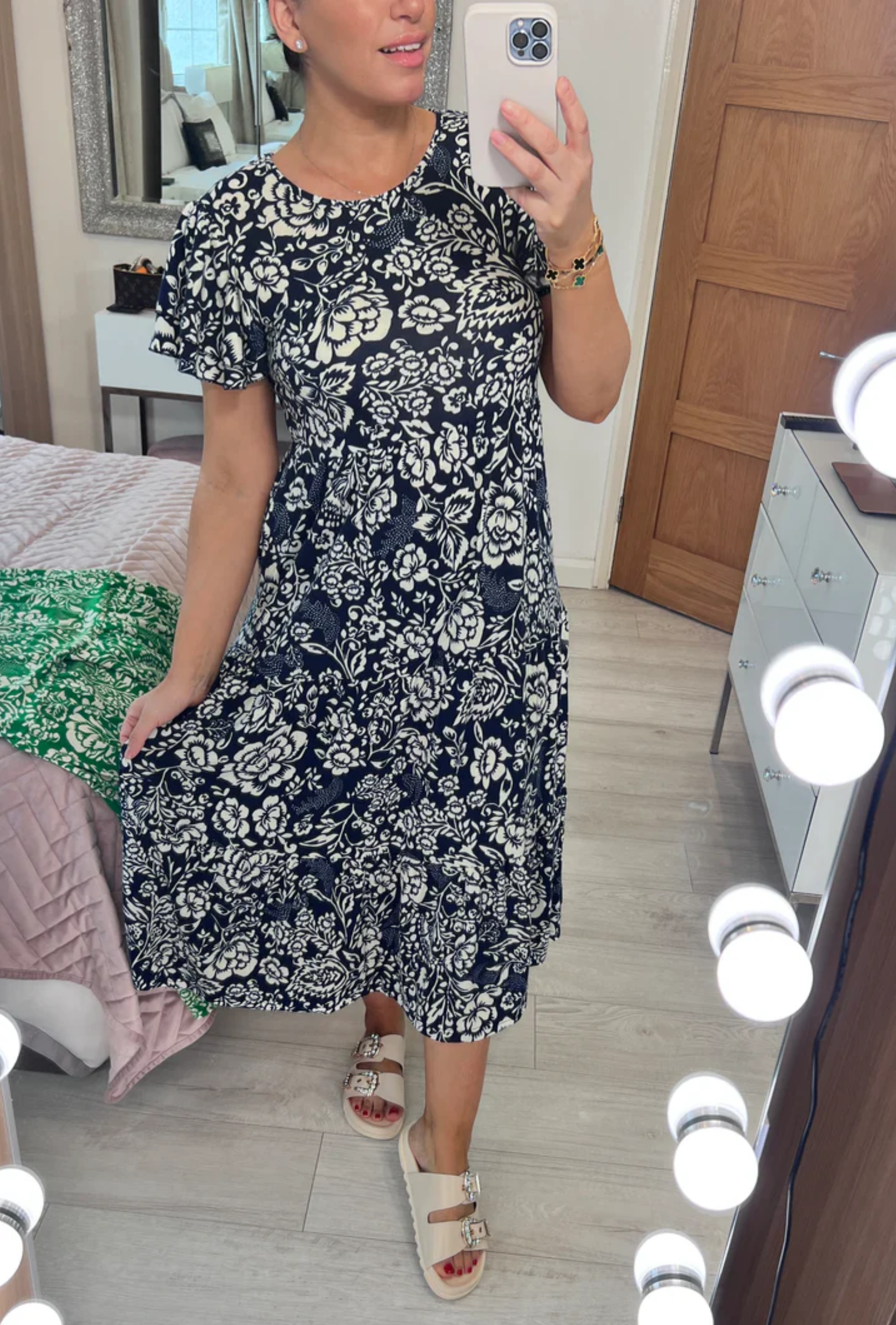 Détails : Imprimé floral, manches courtes, taille élastiquée et longueur midi.