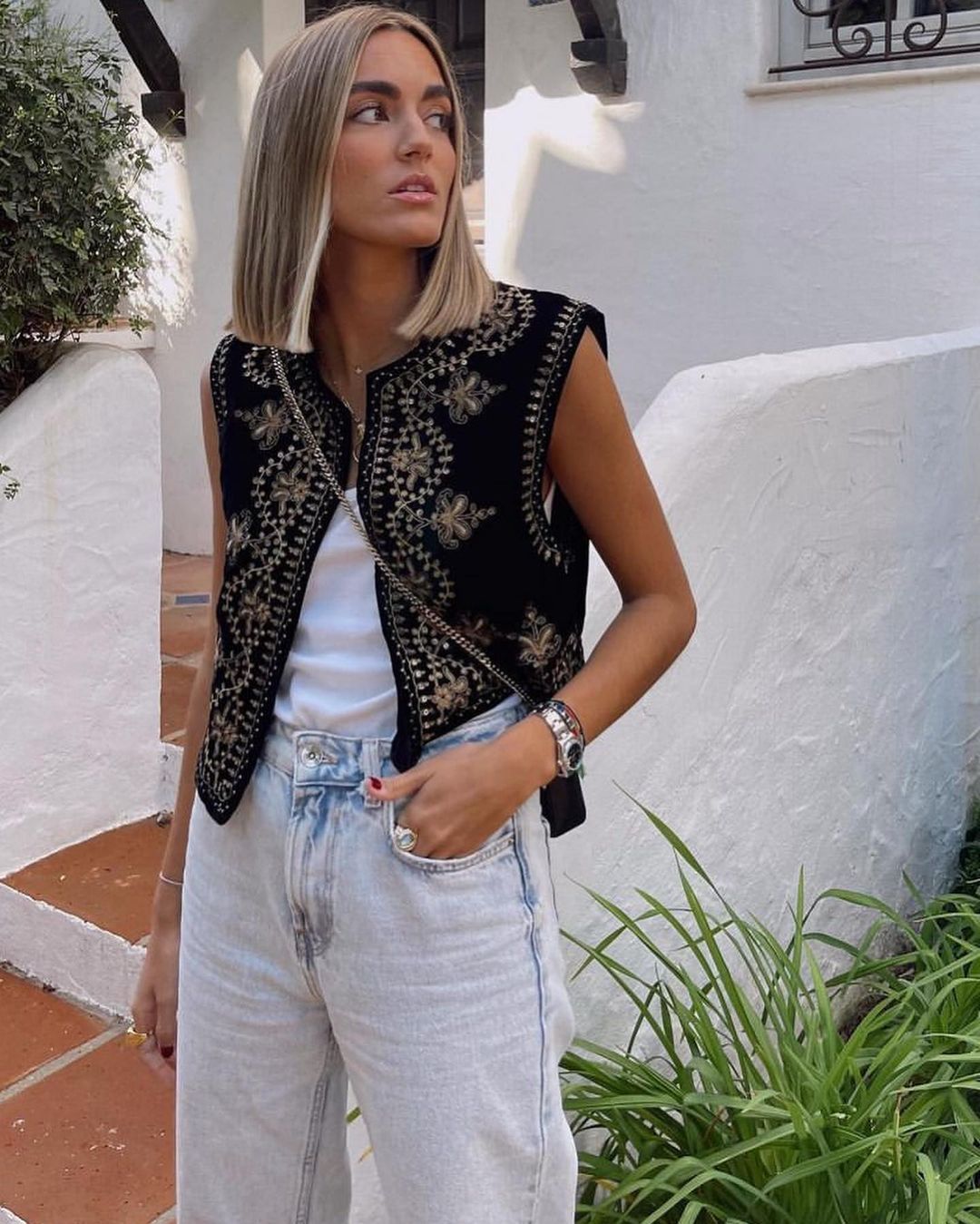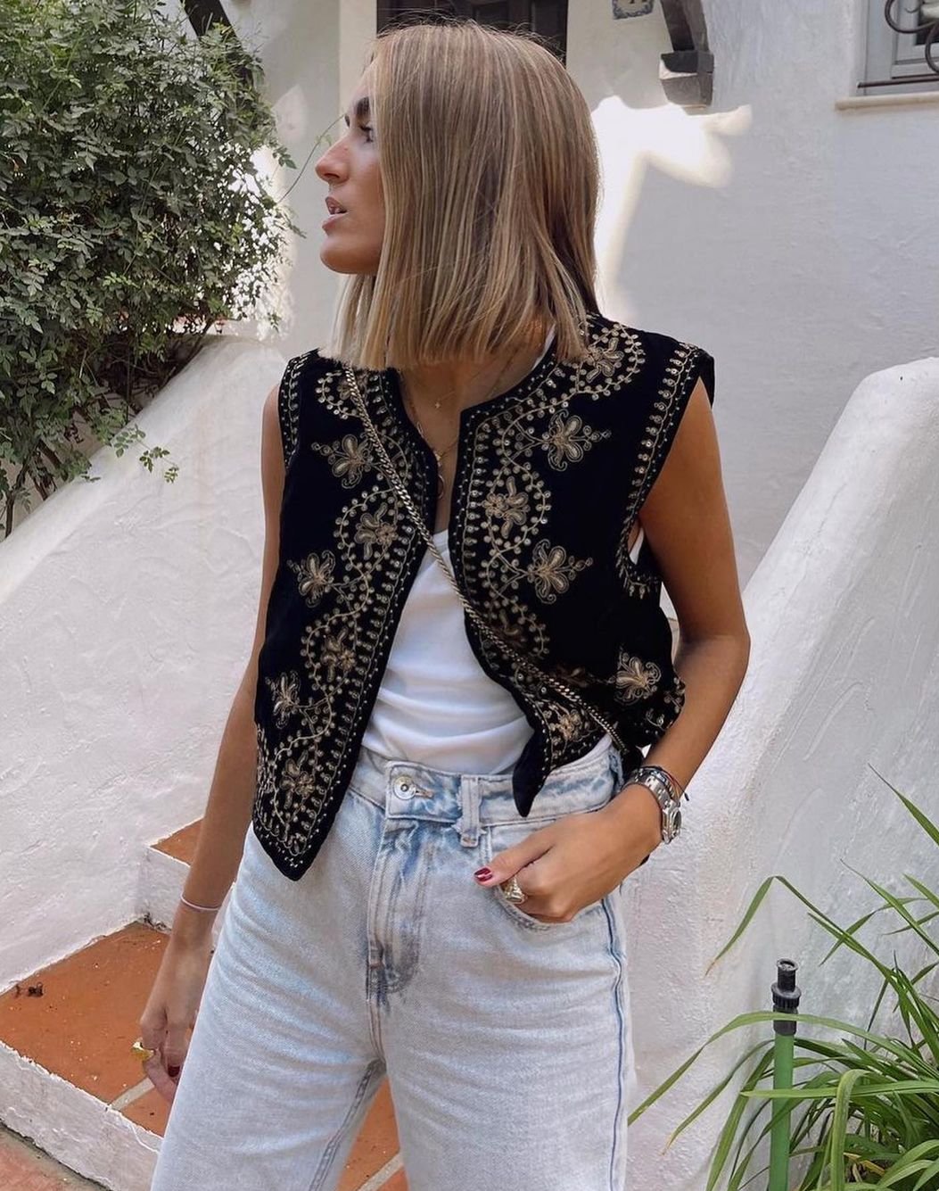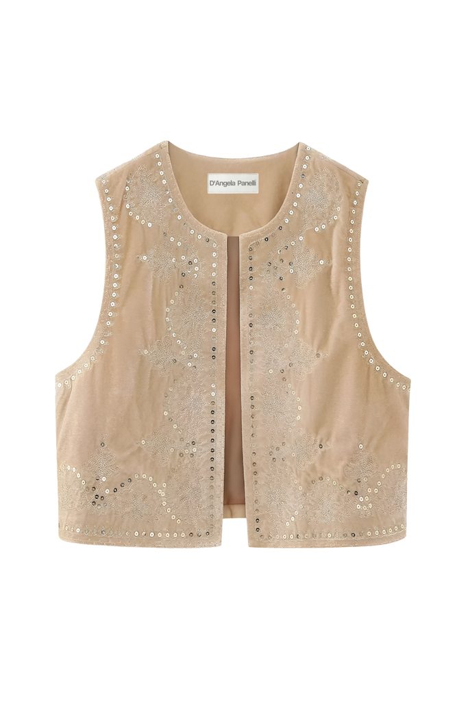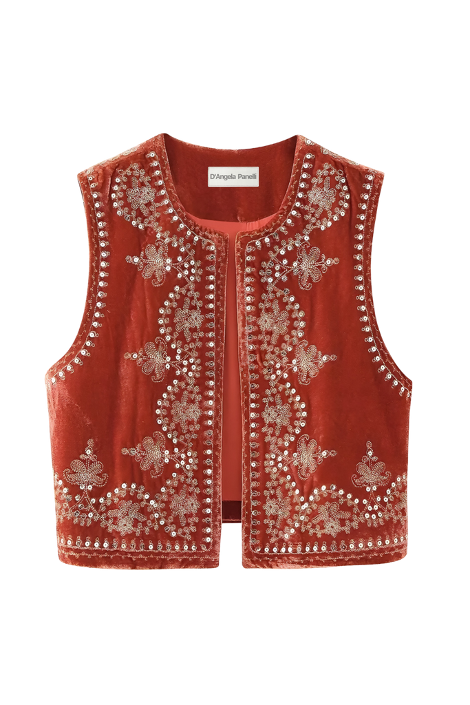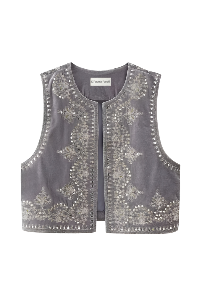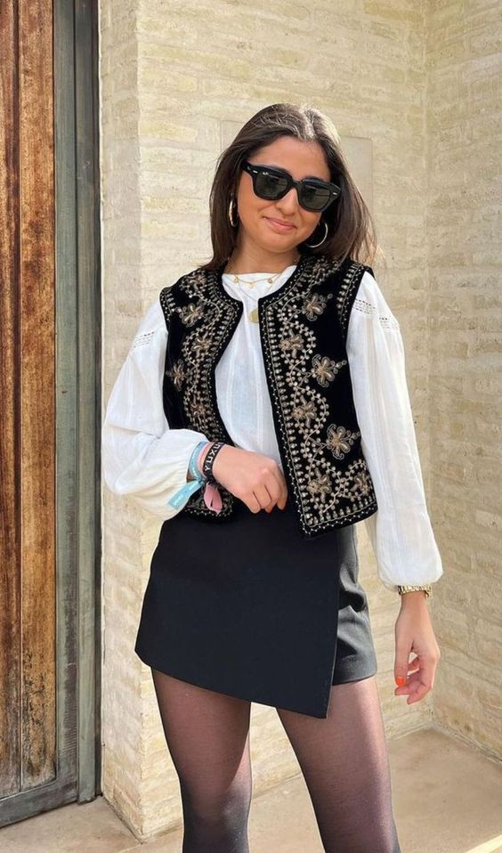 Un gilet unique, brodé à la main. Confectionné avec soin pour un look élégant et stylé. Parfait pour toute occasion.