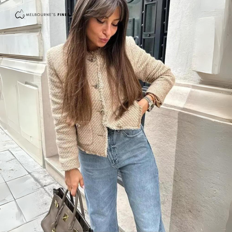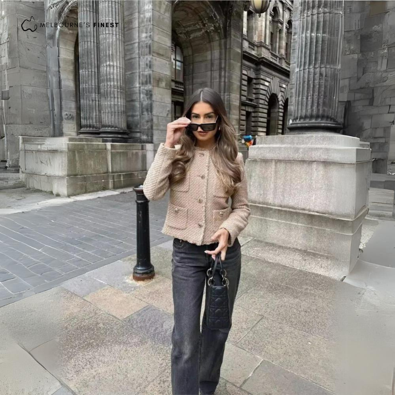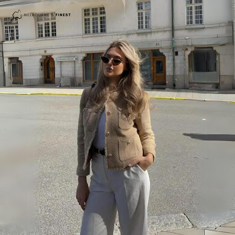 More than just an autumn jacket, the Scarlett™ Stylish Women's Jacket is your key to effortless elegance and sophistication. Crafted from fashionable tweed, this cropped masterpiece offers unrivaled comfort and timeless style. With its sophisticated design and practical features like a chest pocket and long sleeves, this jacket seamlessly transitions from day to night, making it the perfect outerwear solution for any ensemble.
