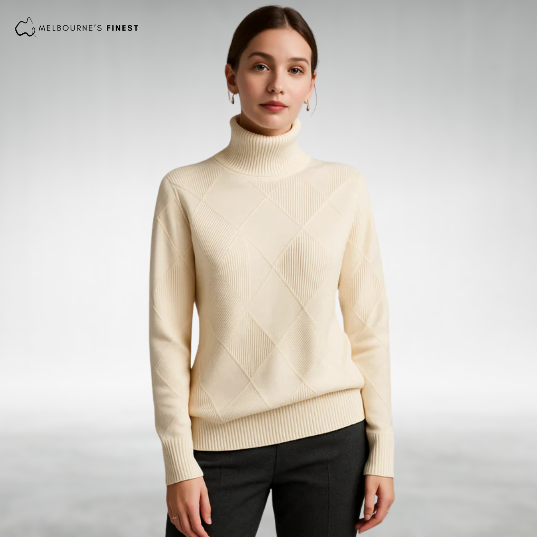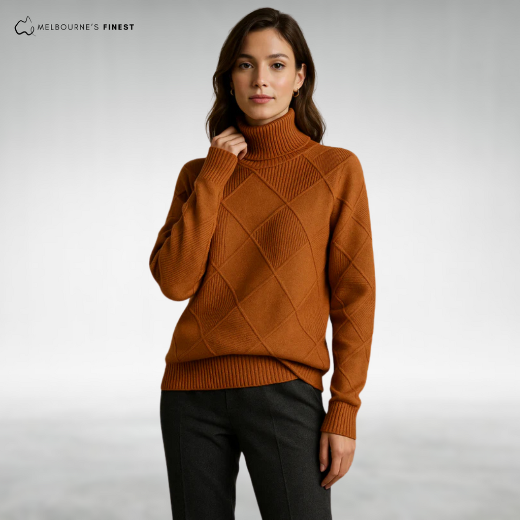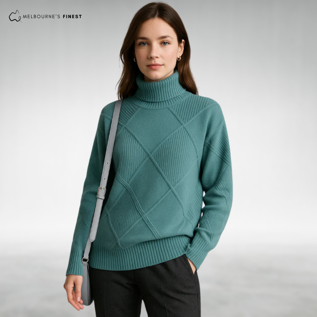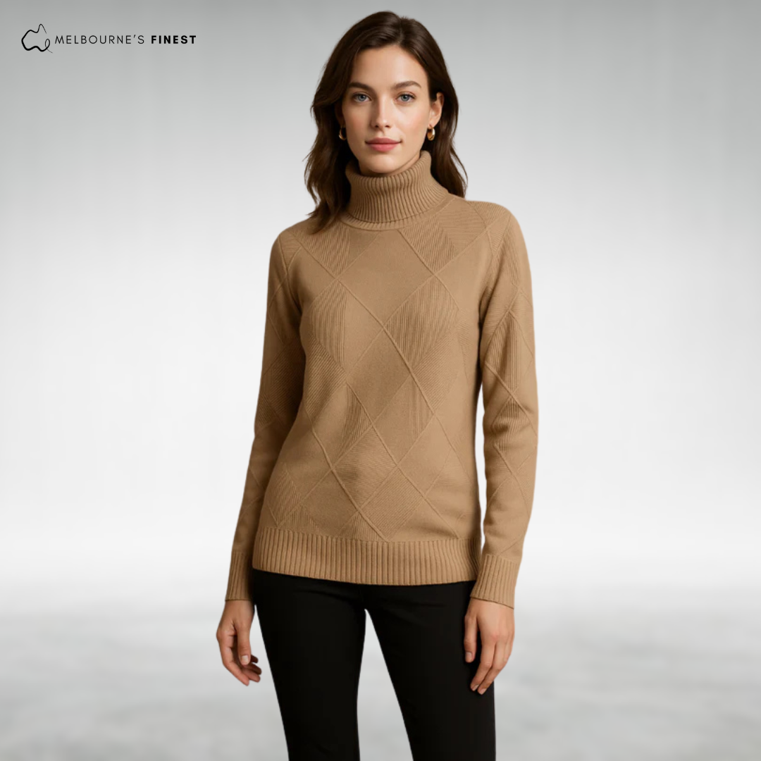 The Sienna™ Elegant Knit Turtleneck features a beautiful diamond-knit pattern paired with a warm yet breathable fabric, offering soft, stretchable comfort that moves with you throughout the day. This turtleneck solves the common problem of bulky, itchy sweaters by combining elegant design with cozy wearability, making it a perfect layering piece for any occasion.