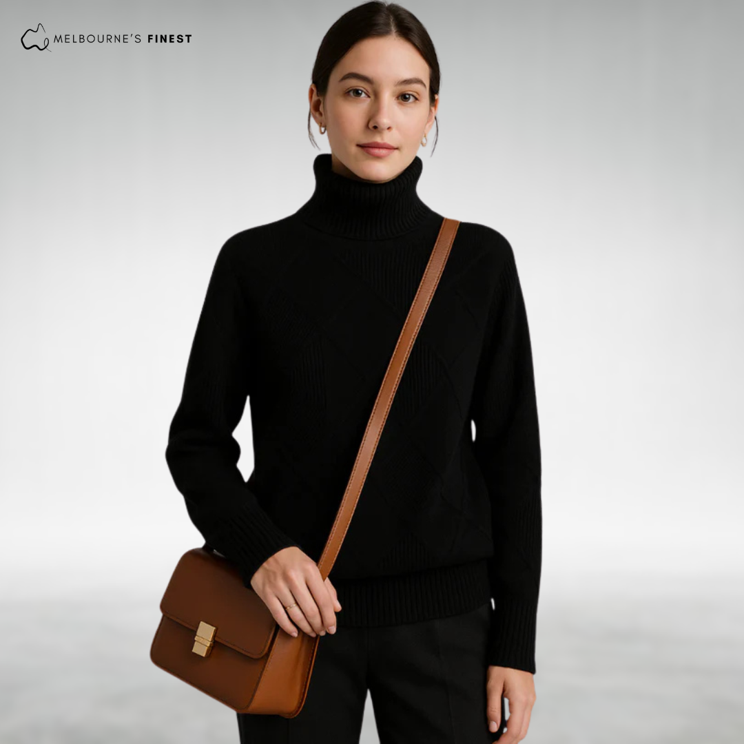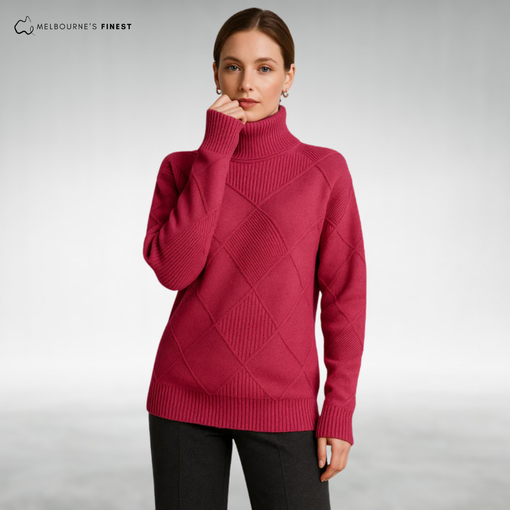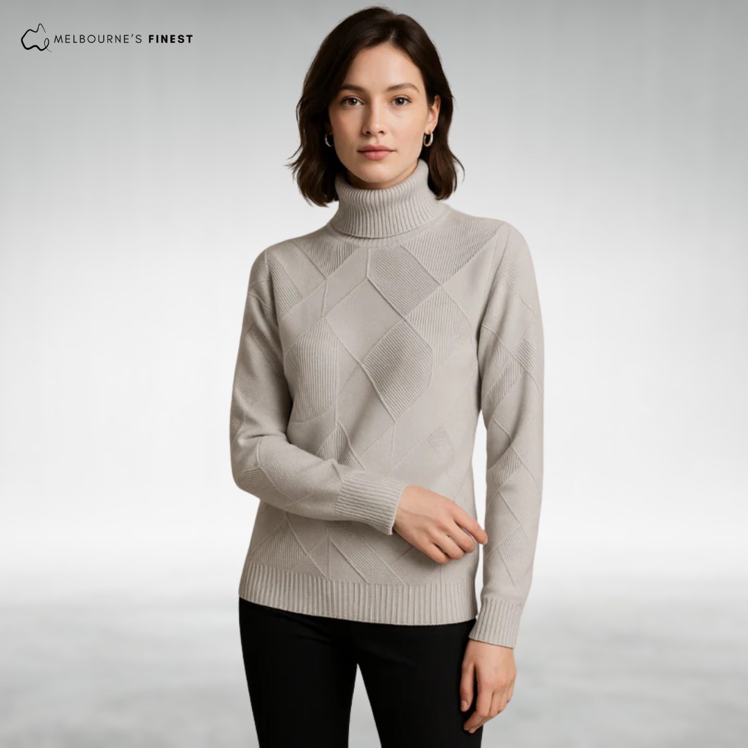 The Sienna™ Elegant Knit Turtleneck features a beautiful diamond-knit pattern paired with a warm yet breathable fabric, offering soft, stretchable comfort that moves with you throughout the day. This turtleneck solves the common problem of bulky, itchy sweaters by combining elegant design with cozy wearability, making it a perfect layering piece for any occasion.